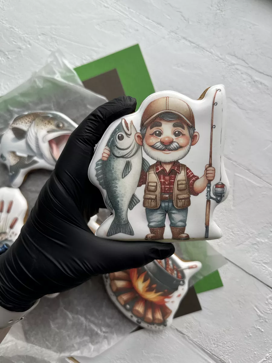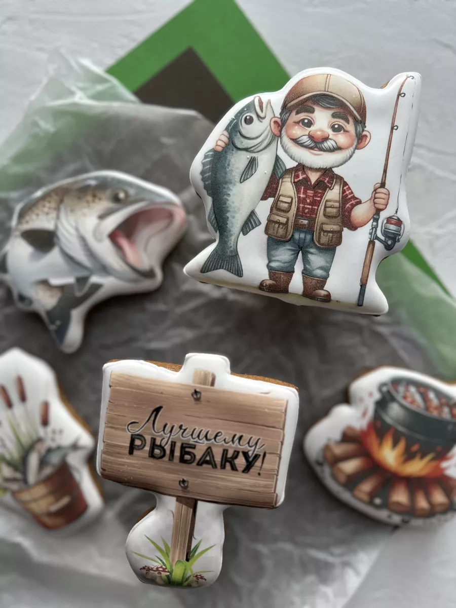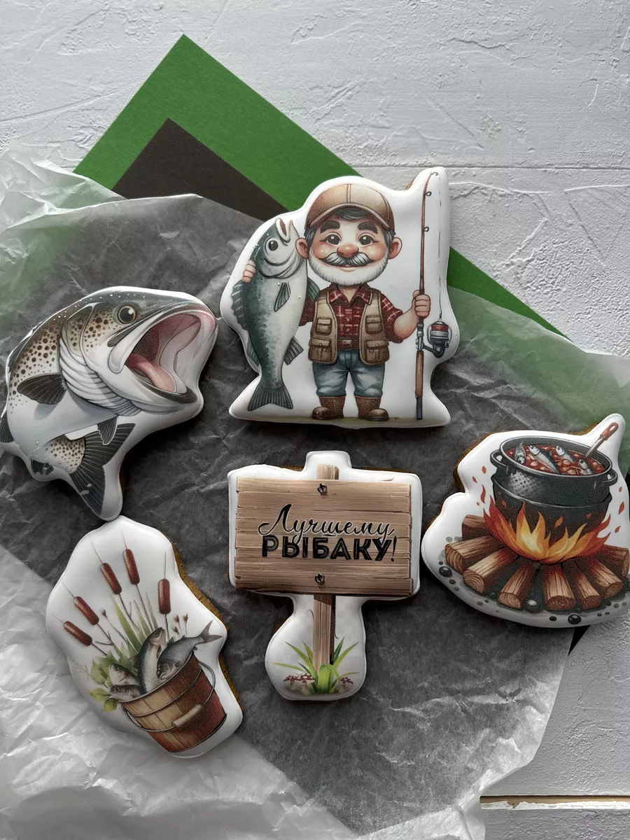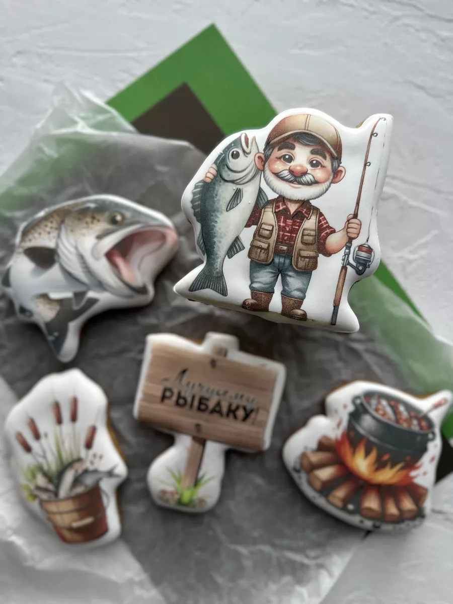 Набор расписных имбирных пряников для лушего рыбака станет отличным украшением на торт или праздничный стол на День рождения мужчины, который любит рыбалку! Яркие фигурные пряники также могут служить интересным самостоятельным подарком мужу или папе, а еще любимому дедушке. Вы можете подарить пряники начальнику, а также другу или коллеге. В наборе 5 топперов и 5 шпажек. Размер имбирных пряников 9,5-11 см. Наши праздничные пряники в глазури порадуют Вас приятным вкусом и ароматом. Мы тщательно следим за качеством нашей продукции, поэтому пряники имеют натуральный состав и изготовлены нашими кондитерами вручную. Каждый пряник упакован в индивидуальный герметичный пакет, что гарантирует его свежесть. Идеальный вкусный подарок. Продукт сертифицирован.