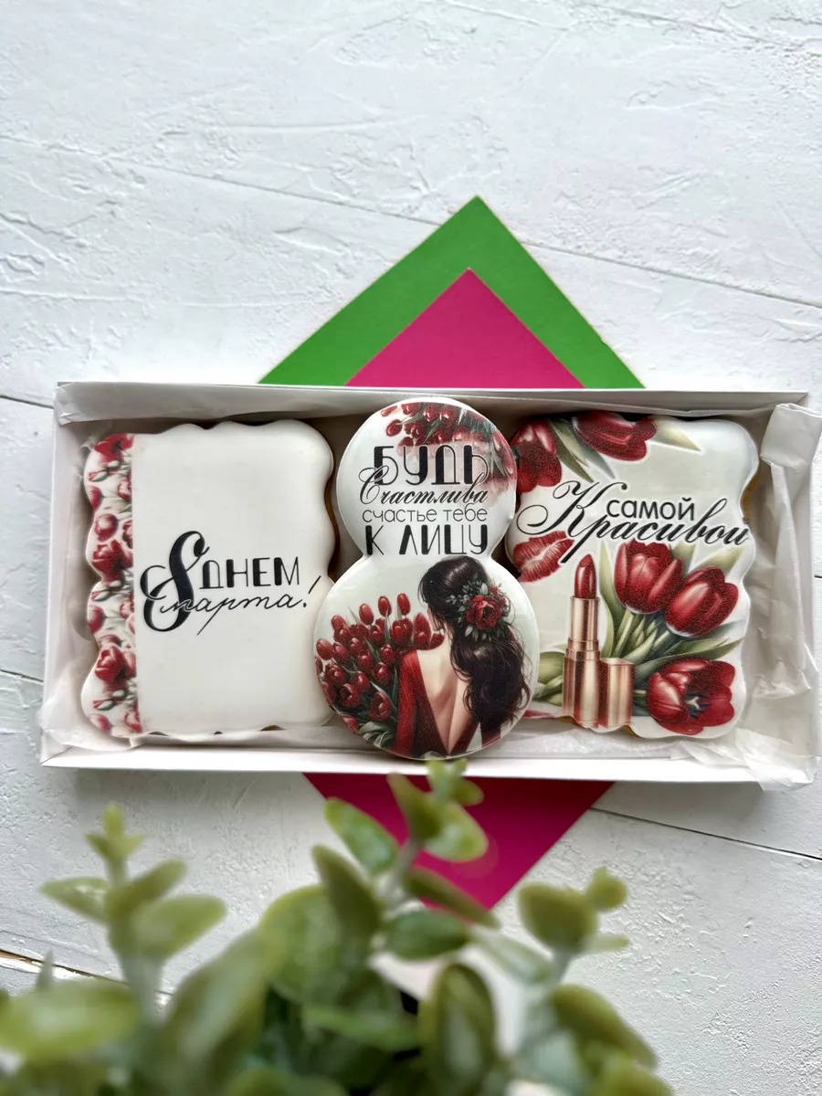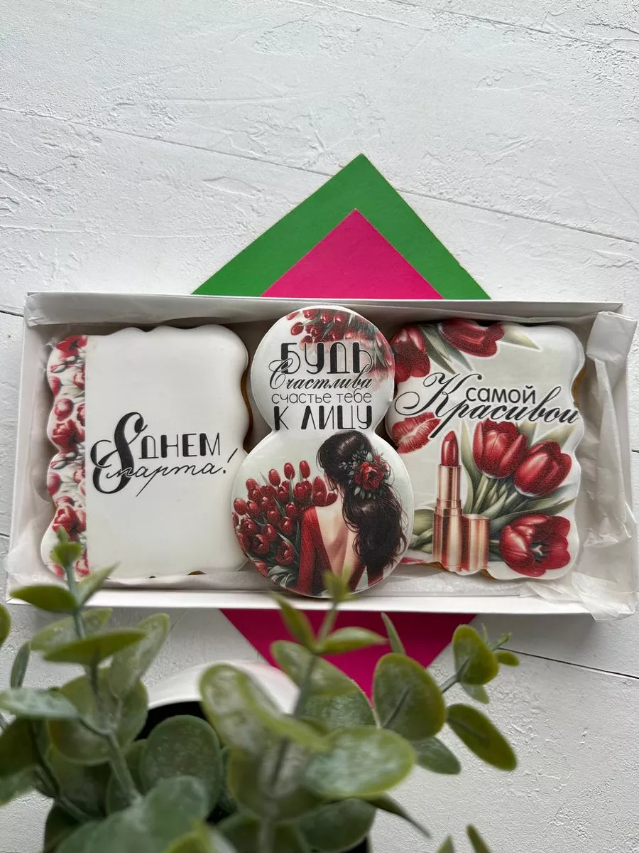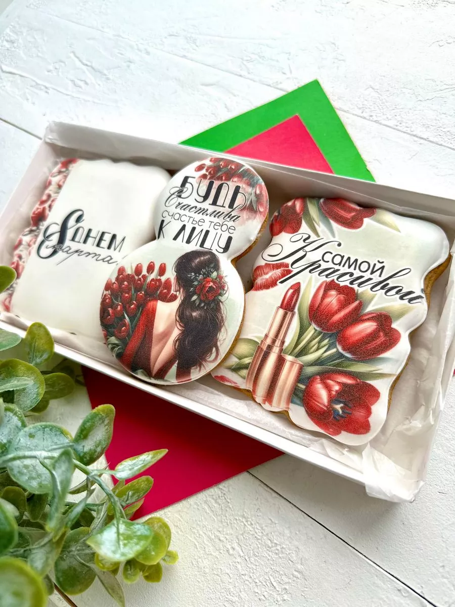 Подарочный набор красивых имбирных пряников на 8 марта - это сладкий подарок как для детей, так и для взрослых. Набор сладостей отлично подойдет для угощения на утренник в детский сад, школу, на праздничный стол дома и на работе. Замечательный вариант корпоративного подарка для женщин на Международный женский день. Наши медовые пряники в глазури невероятно ароматные. Вкусный бокс и оригинальный набор - именно то, что нужно, если вы не знаете, какой сделать подарок на восьмое марта. Запакованы в красивую подарочную коробку с лентой. У нас есть разные варианты, вы обязательно найдете свой идеальный набор! Подойдет для подарка любой женщине, подруге, девушке, любимой, коллеге, сестре, девочке, племяннице, внучке, дочке, жене, маме, бабушке, учительнице, учителю, преподавателю, начальнице, директору. Глазированные пряники имеют натуральный состав и изготовлены нашими кондитерами вручную. Каждый пряник упакован в индивидуальный герметичный пакет, что гарантирует его свежесть. Продукт сертифицирован.