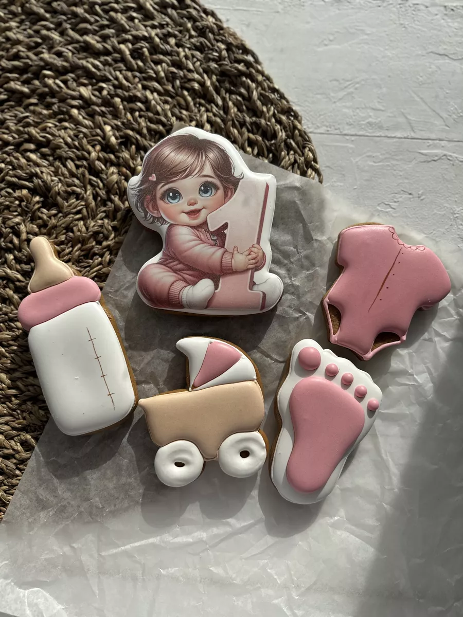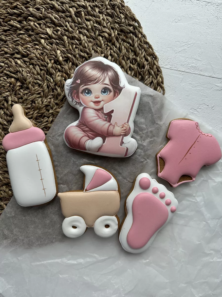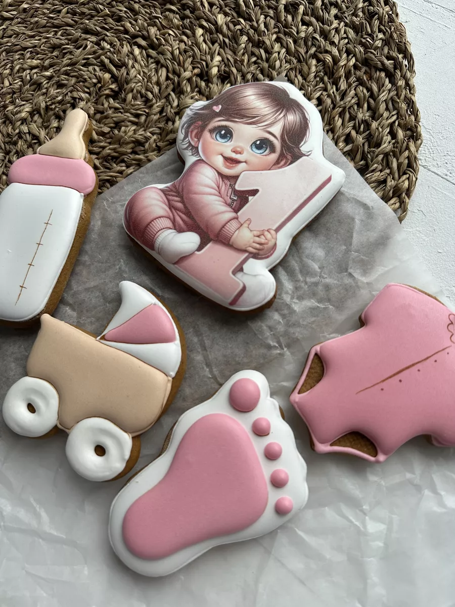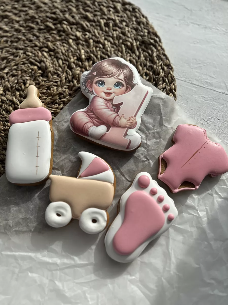 равнодушным ни одну дочь! Это отличное вкусное угощение для кэнди бара. В наборе 5 топперов с красочной малышкой в розовых тонах. Наши пряники в глазури порадуют Вас приятным вкусом и ароматом, идеальное дополнение к чаю, кофе, какао, молоку. Они имеют натуральный состав и изготовлены нашими кондитерами вручную. Размер: 8-11 см. Каждый пряник упакован в индивидуальный герметичный пакет, что гарантирует его свежесть. Продукт сертифицирован.