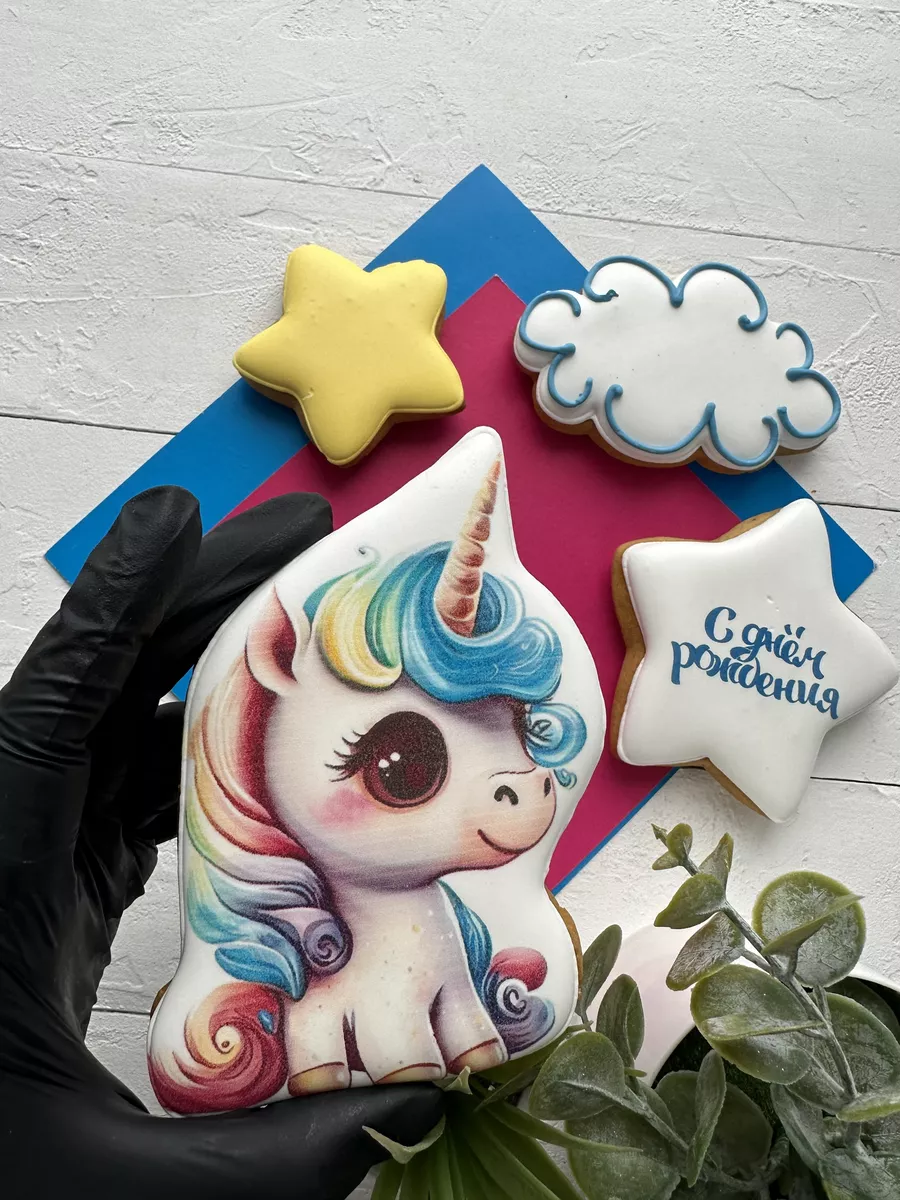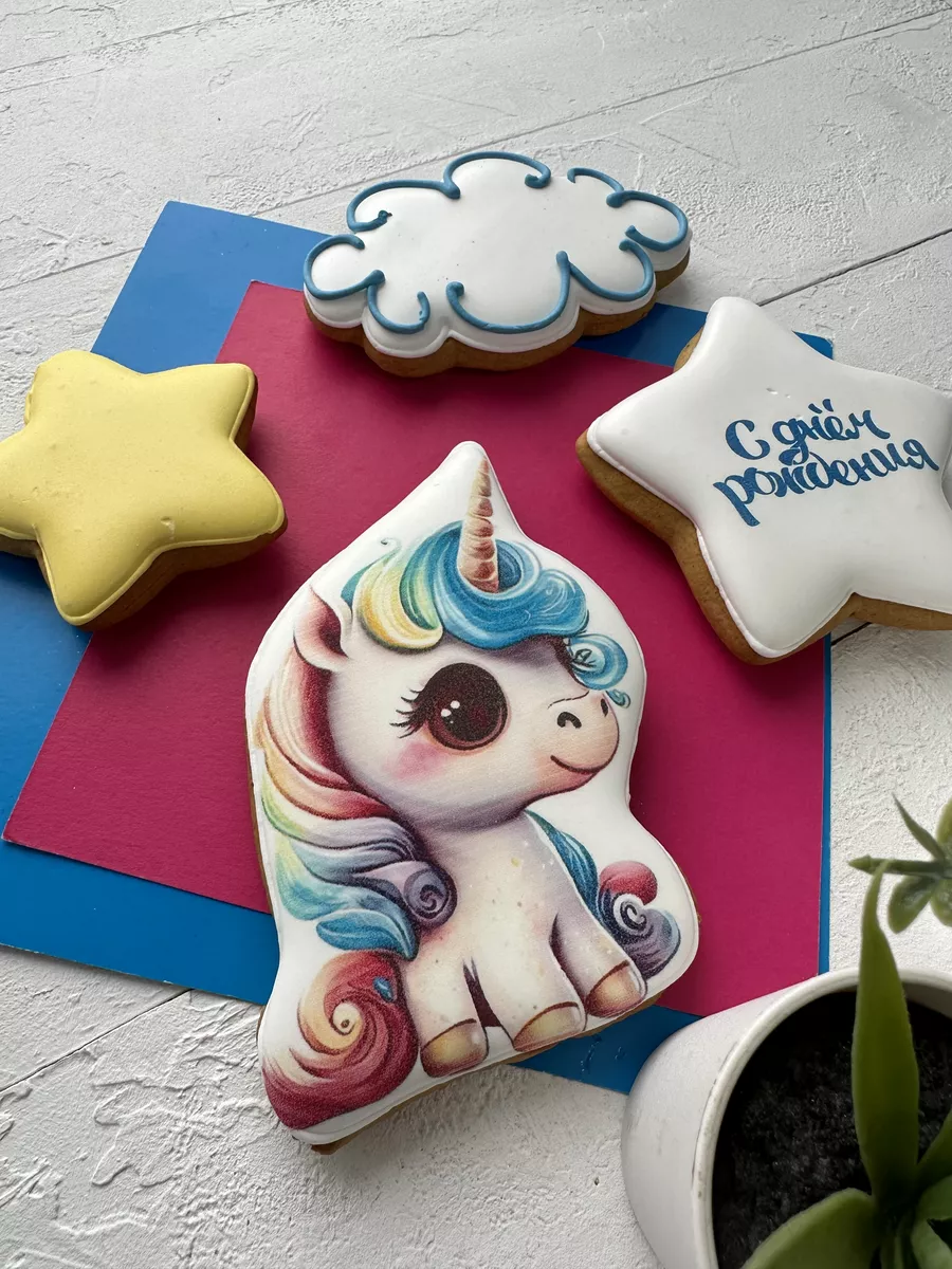 Когда речь идет о детских Днях рождениях, сладости - это неотъемлемая часть праздника. Имбирные пряники на торт для девочки и для мальчика - одно из лучших лакомств, которые можно предложить для этого особого дня. Глазированные пряники Единорог выглядят очень эффектно и невероятно мило. Это съедобное украшение на торт обязательно понравится любому ребенку.