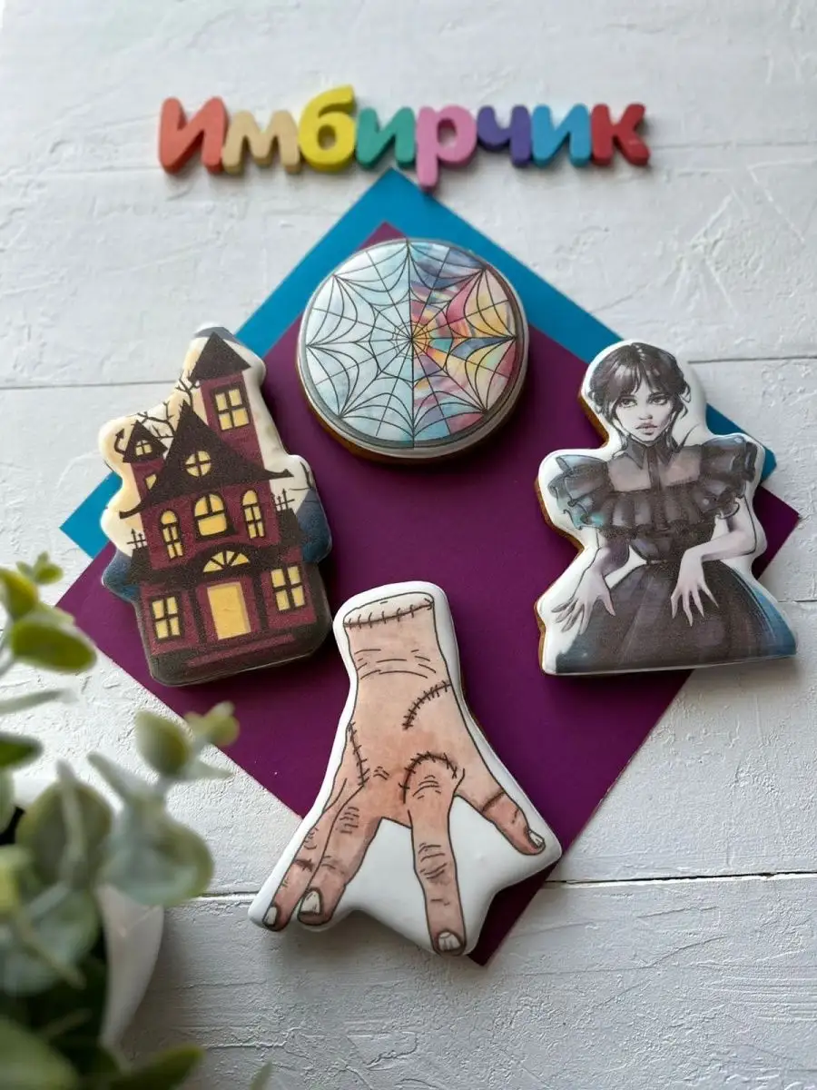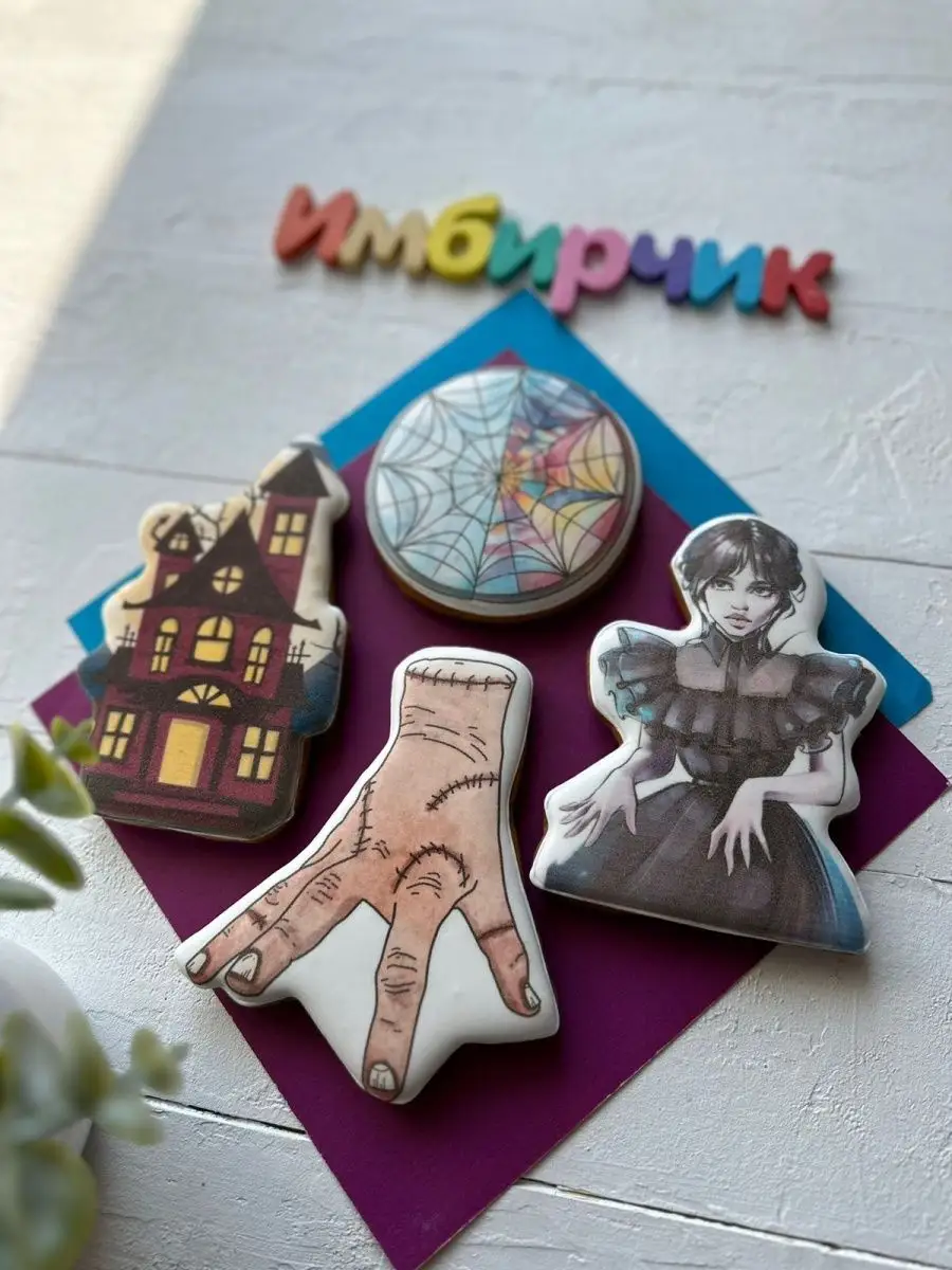 Невероятный аромат свежих, душистых имбирных пряников, созданных с любовью и заботой, не оставит равнодушным никого! Они станут настоящим подарком для любой девочки поклонницы Уэнсдей Аддамс на 6, 7 и 8 лет, понравятся девчонкам в 9, 10 и 11 лет, и особенно девочкам подросткам. Набор съедобных украшений на торт из четырех пряников в виде персонажей сериала Wednesday на палочке, сделанных только из натуральных ингредиентов, точно понравится вашей дочке и останется в ее памяти на долгие годы. Ведь День рождения - это особенный момент в жизни ребенка. Пряники из нашего комплекта помогут сделать праздник особенным и запоминающимся, каждый из них - это вкусное угощение и оригинальный сувенир. Но это не только сладости, но и необычное дополнение к другим подаркам. Ваша дочь будет в восторге от их неповторимого вкуса и запаха, а также останется счастливой владелицей уникального вкусного подарка на свой День рождения. Мы обновили упаковку, которая сохранит кондитерское изделие при транспортировке до Вашего праздничного стола