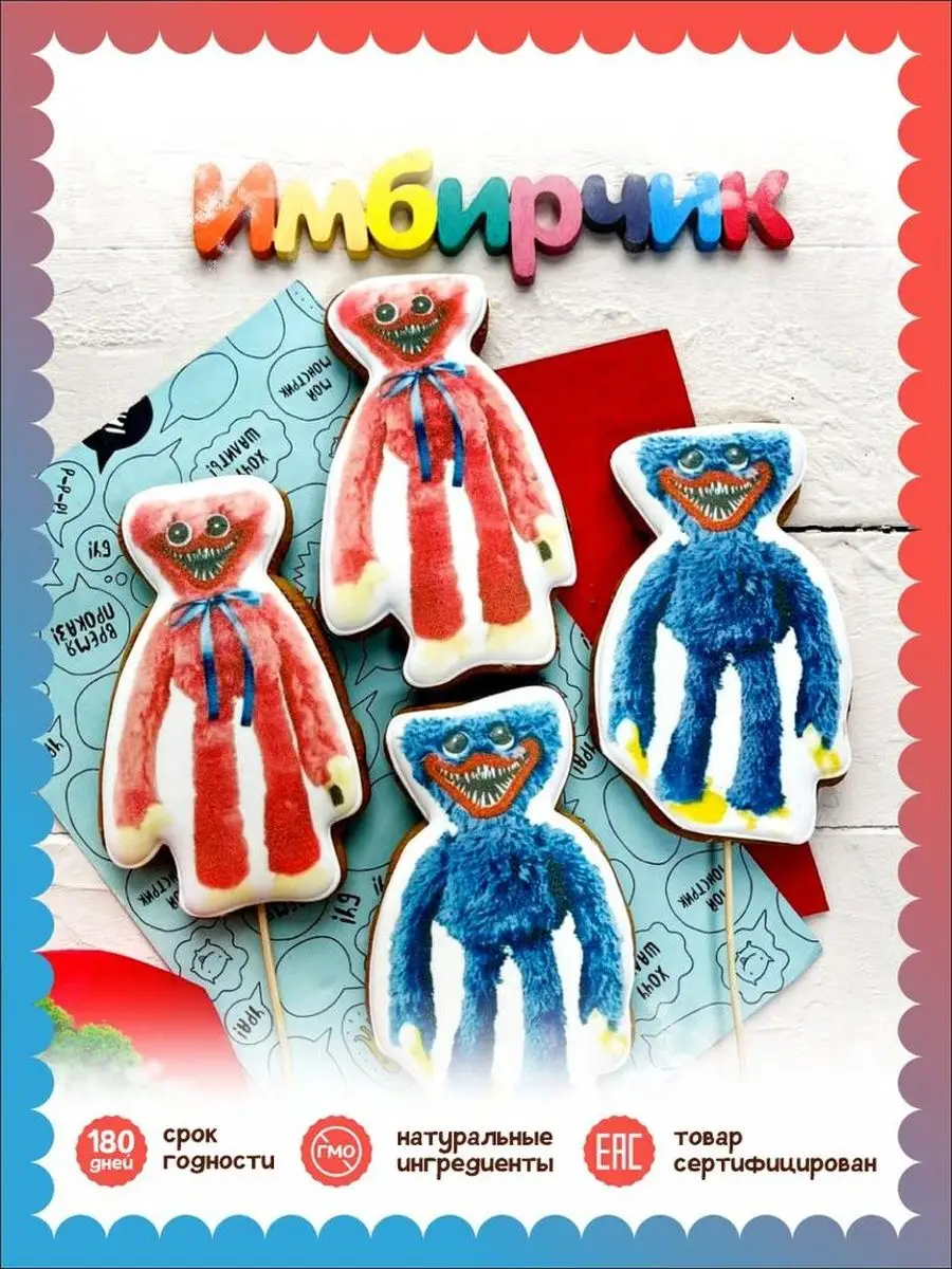 Набор расписных имбирных пряников на палочке в виде фигурок Хаги Ваги станет отличным украшением для торта или праздничного стола на День рождения ребенка! Яркие пряники Huggy Wuggy также могут служить интересным самостоятельным подарком для мальчика и девочки. В наборе 4 пряника для торта с красочными героями Хагги Вагги и Киси Миси. Наши глазированные пряники с днем рождения порадуют Вас приятным вкусом и ароматом, идеальное дополнение к чаю, кофе, какао, молоку. Только представьте, как будут рады дети своим любимым фигуркам героев в виде пряников в торт! Эти оригинальные съедобные украшения на торт запомнятся вашему малышу надолго! Праздничные пряники для украшения торта имеют натуральный состав и изготовлены нашими кондитерами вручную. Каждый пряник упакован в индивидуальный герметичный пакет, что гарантирует его свежесть. В каждом прянике есть отверстие для того, чтобы вставить шпажку. 4 палочки идут в комплекте, поэтому Вы без труда сможете самостоятельно украсить торт на День рождения сына или дочки. Пряники имбирные на палочке - продукт сертифицирован.