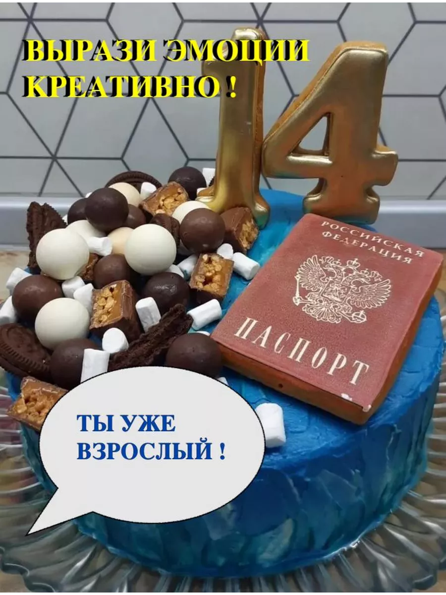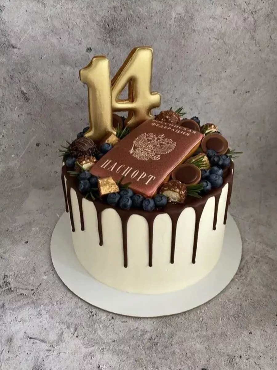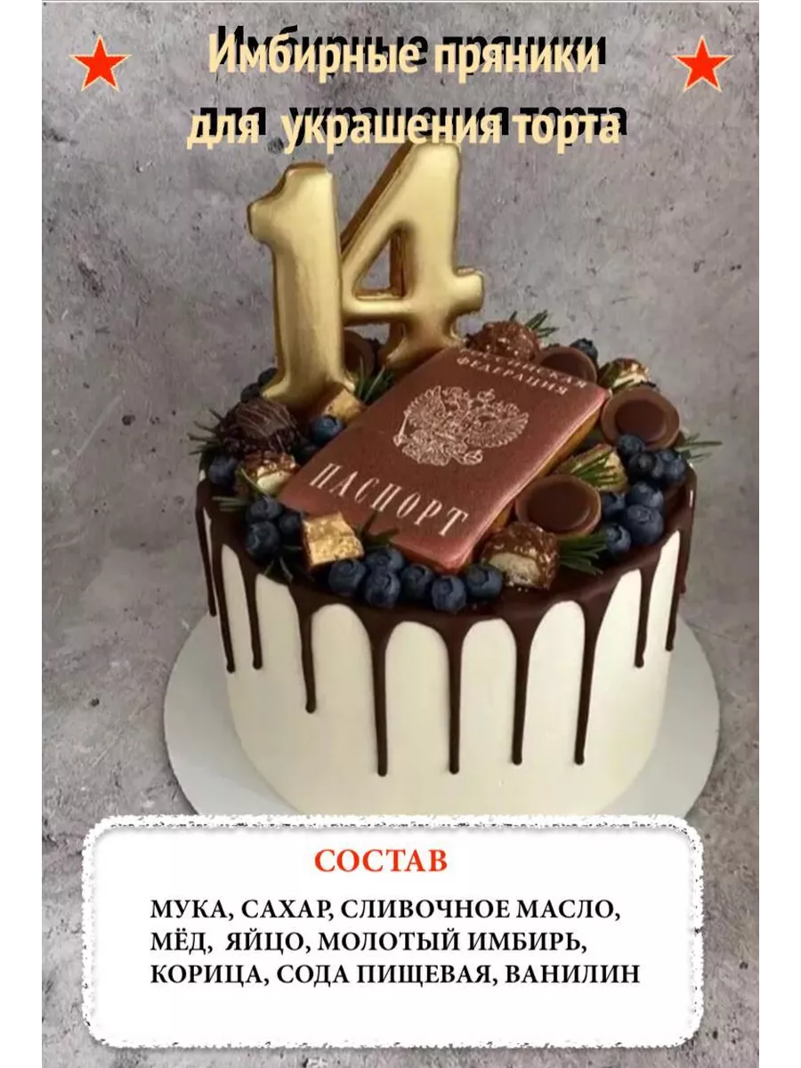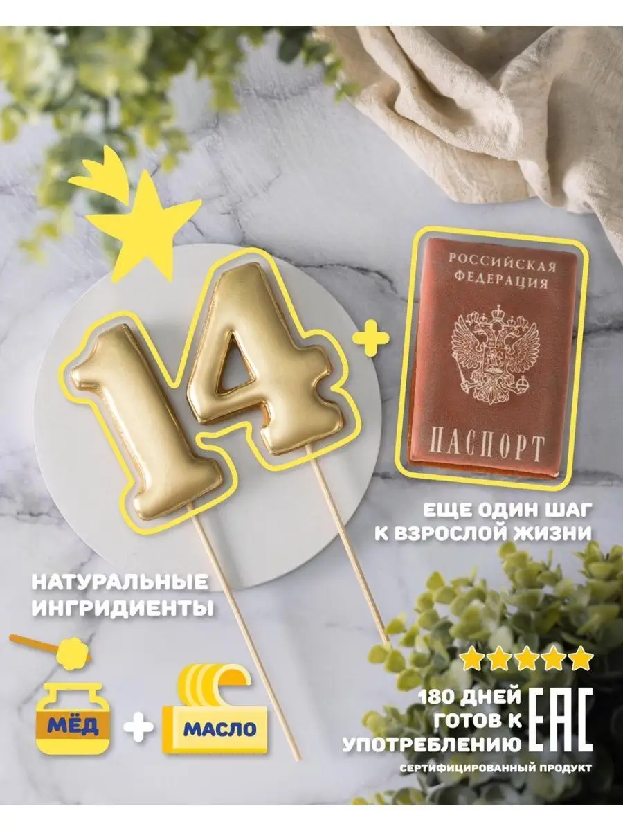 Набор съедобных украшений на торт из трех пряников в виде золотых цифр и фигурки в форме паспорта РФ на палочке, сделанные только из натуральных ингредиентов, точно понравится вашему любимому сыну или дочери, и останется в его памяти на долгие годы. Ведь 14 лет - это особенный момент в жизни ребенка. Пряники из нашего комплекта помогут сделать День рождения девочки и мальчика особенным и запоминающимся, каждый из них - это вкусное угощение и оригинальный сувенир. Это не только сладости, но и оригинальное дополнение к другим подаркам. Ваш ребенок будет в восторге от их неповторимого вкуса и запаха, а также останется счастливым владельцем оригинального и уникального подарка на свой День рождения. Мы обновили упаковку, которая сохранит кондитерское изделие при транспортировке до Вашего праздничного стола. Уверены, Вы останетесь довольны нашим украшением для торта!