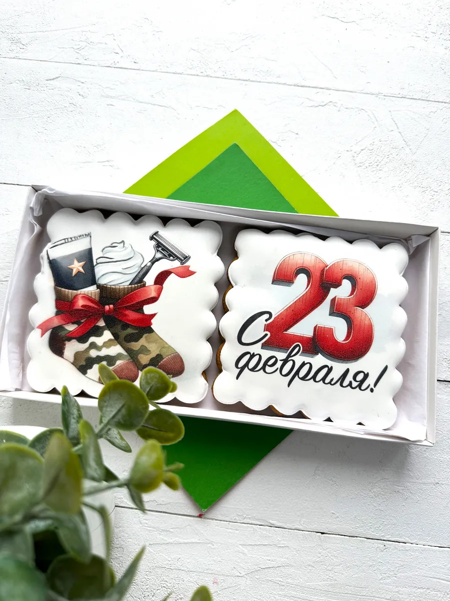 Подарочный набор имбирных пряников на 23 февраля - это сладкий подарок для мужчин. Идеальный вариант для корпоративного подарка сотрудникам на работе. Наши медовые пряники в глазури невероятно ароматные. Вкусный бокс и оригинальный сладкий набор - именно то, что нужно, если вы не знаете, какой сделать подарок мужчинам на День защитника Отечества. Подойдет для подарка другу, или парню, коллеге, брату, мужу, дедушке, учителю, преподавателю, начальнику, директору. Глазированные пряники имеют натуральный состав и изготовлены нашими кондитерами вручную. Каждый пряник упакован в индивидуальный герметичный пакет, что гарантирует его свежесть. Продукт сертифицирован.