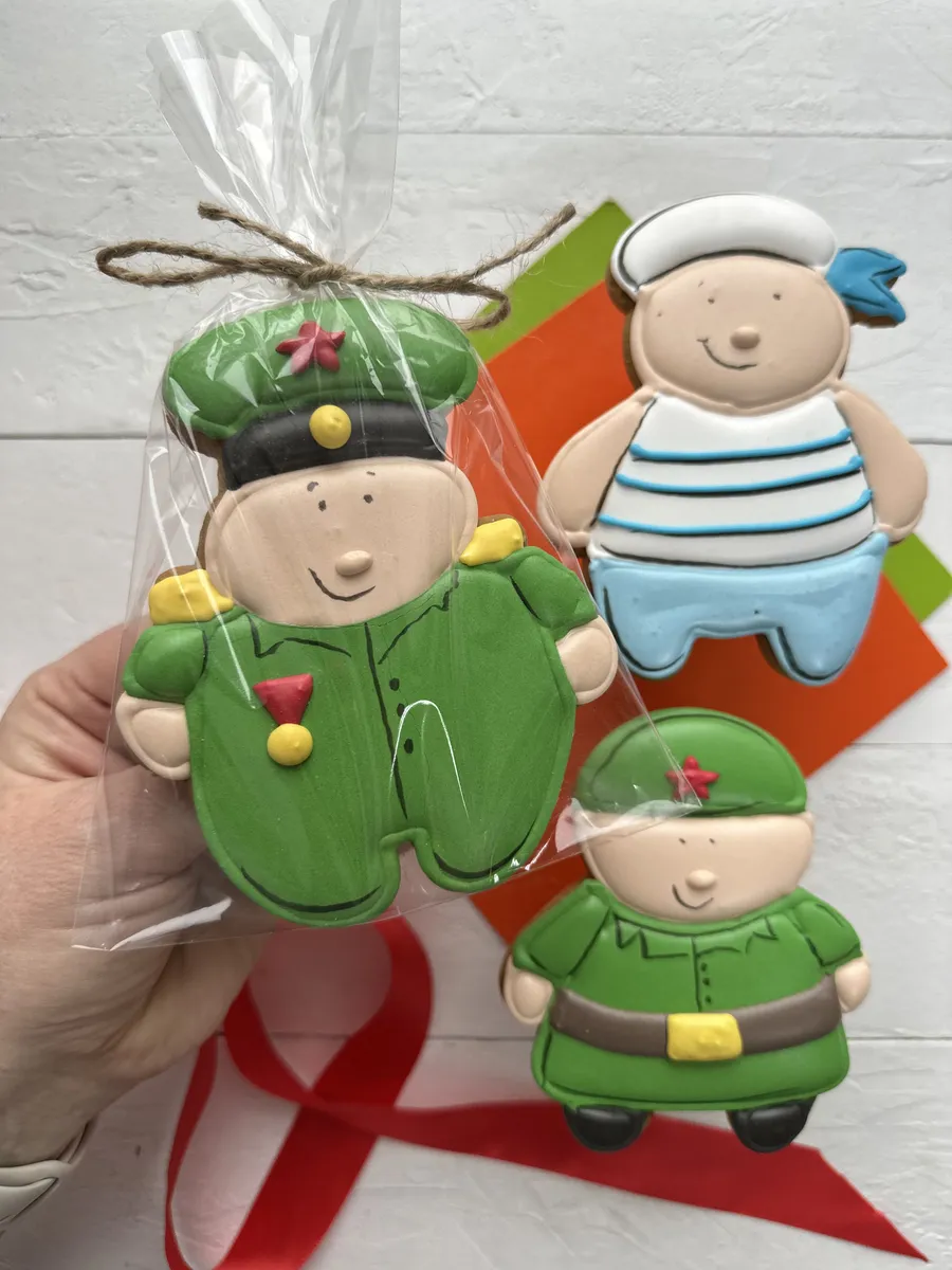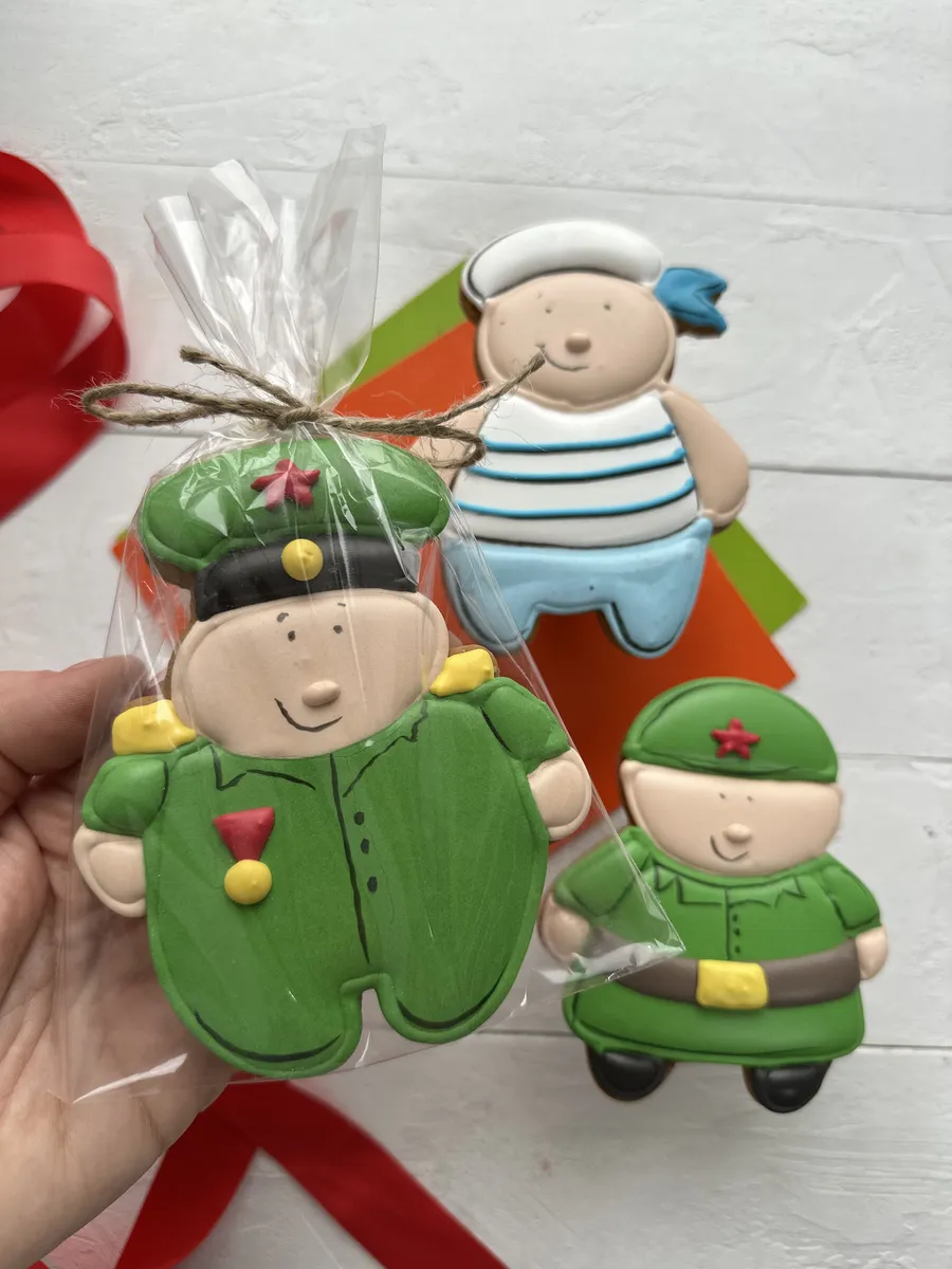 Подарочный набор имбирных пряников на 23 февраля - прекрасный сладкий подарок как для детей, так и для мужчин. Идеальный вариант для подарка в школу или детский сад, а также корпоративный подарок сотрудникам и коллегам на День защитника Отечества. Наши медовые пряники в глазури невероятно ароматные. Вкусный и оригинальный бокс - именно то, что нужно, если вы собираете школьные презенты или подарки в садик мальчикам. Подойдет для подарка сыну, внуку, крестнику или брату. Можно подарить директору, начальнику, другу, папе, дедушке. Глазированные пряники имеют натуральный состав и изготовлены нашими кондитерами вручную. Каждый пряник упакован в индивидуальный герметичный пакет, что гарантирует его свежесть. Размер солдата -11 см, ручная роспись. Продукт сертифицирован.