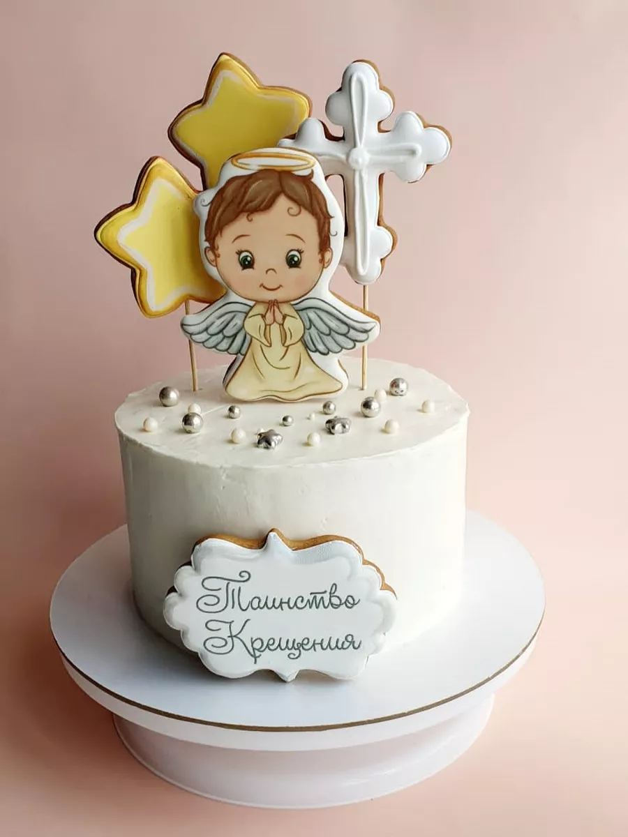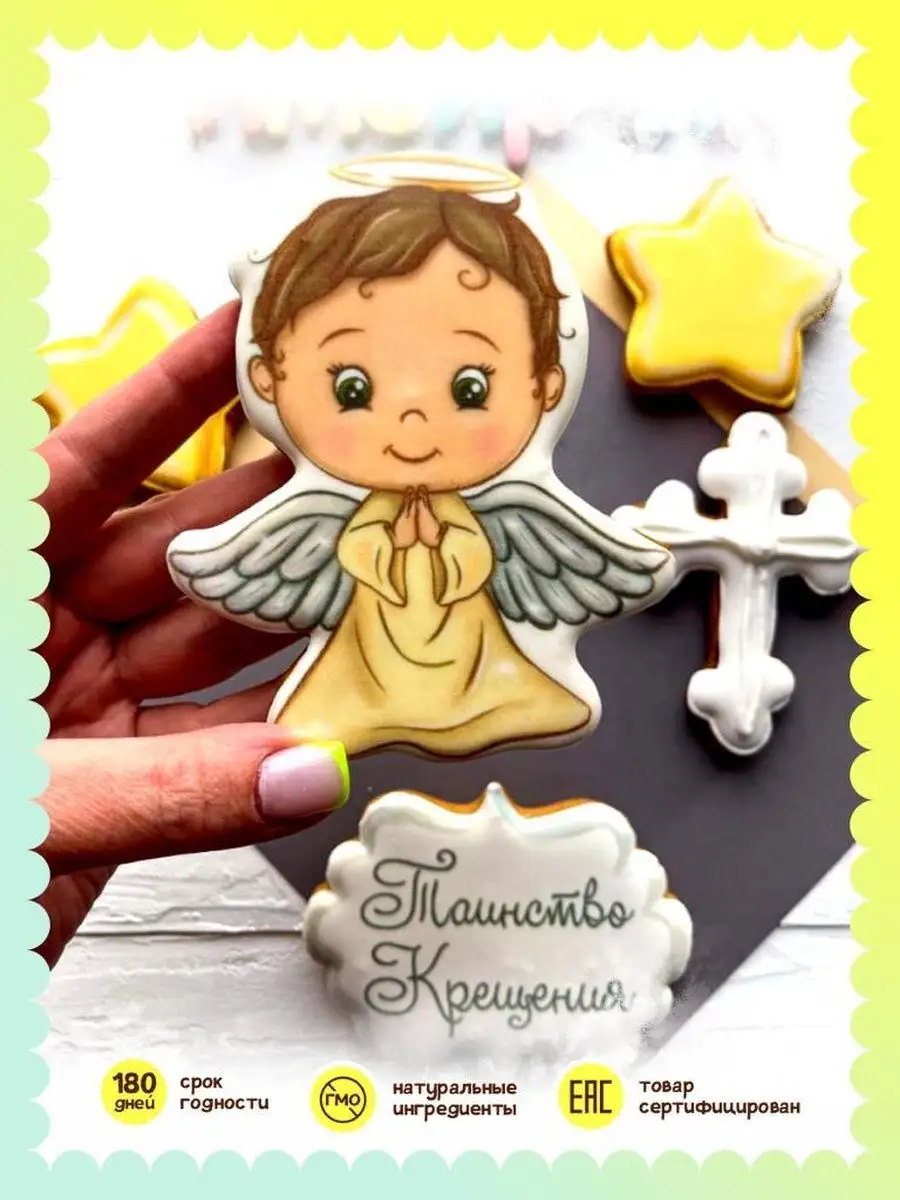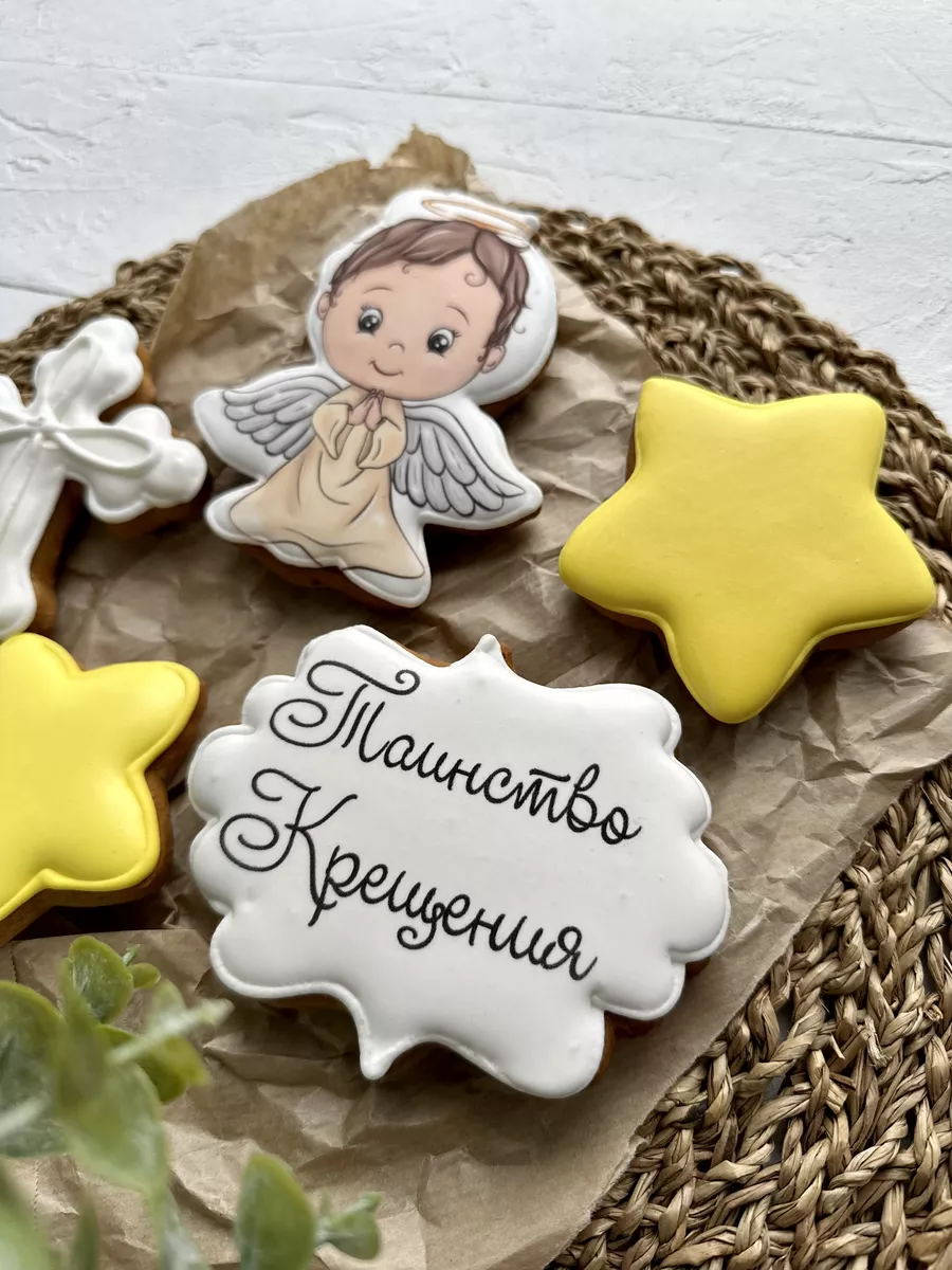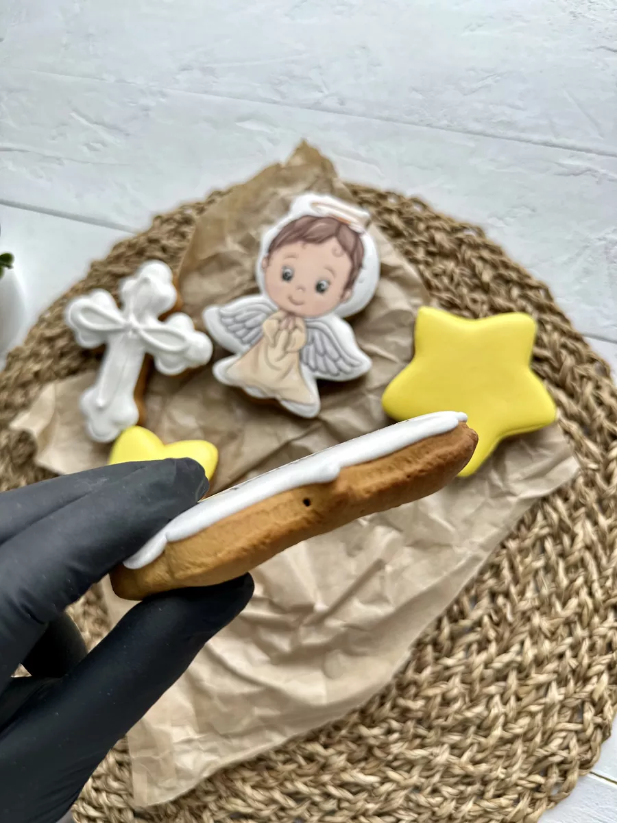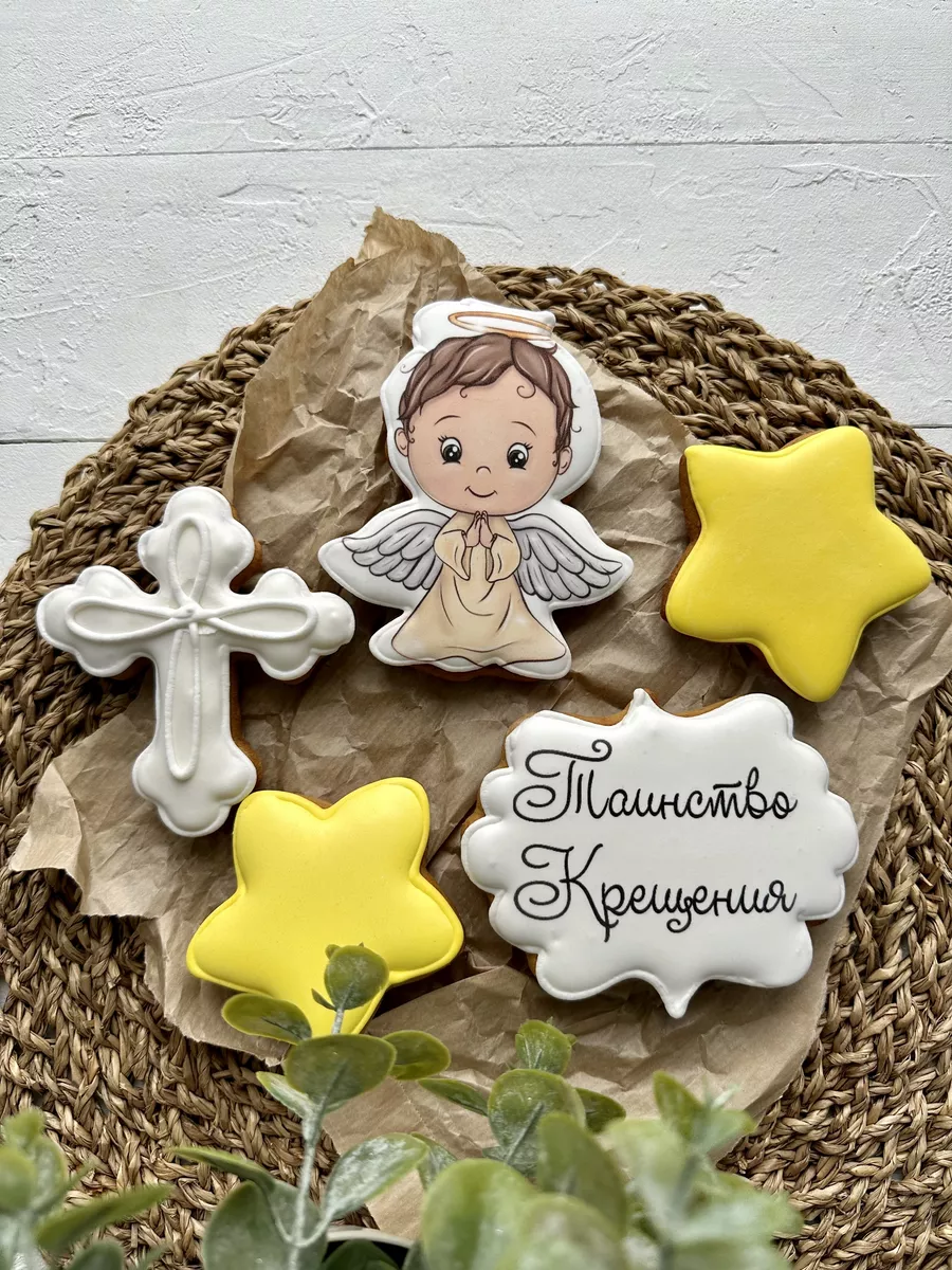 Набор расписных имбирных пряников на крещение ребенка на палочке в виде ангела и звезд станет отличным украшением для торта или праздничного стола в светлый день крестин девочки или мальчика! Яркие пряники ангелочек и звездочки также могут служить интересным самостоятельным подарком для крестника или крестницы. В наборе 5 пряников топперов в торт с красочными рисунками. Наши пряники в глазури порадуют Вас приятным вкусом и ароматом, идеальное дополнение к чаю, кофе, какао, молоку. Крестильные пряники имеют натуральный состав и изготовлены нашими кондитерами вручную. Размер пряников 7-12 см высота, 7-10 см ширина. Каждый пряник упакован в индивидуальный герметичный пакет, что гарантирует его свежесть. Продукт сертифицирован. Пряники на торт имбирные детские, топперы, набор на крещение, подарок, украшения для торта